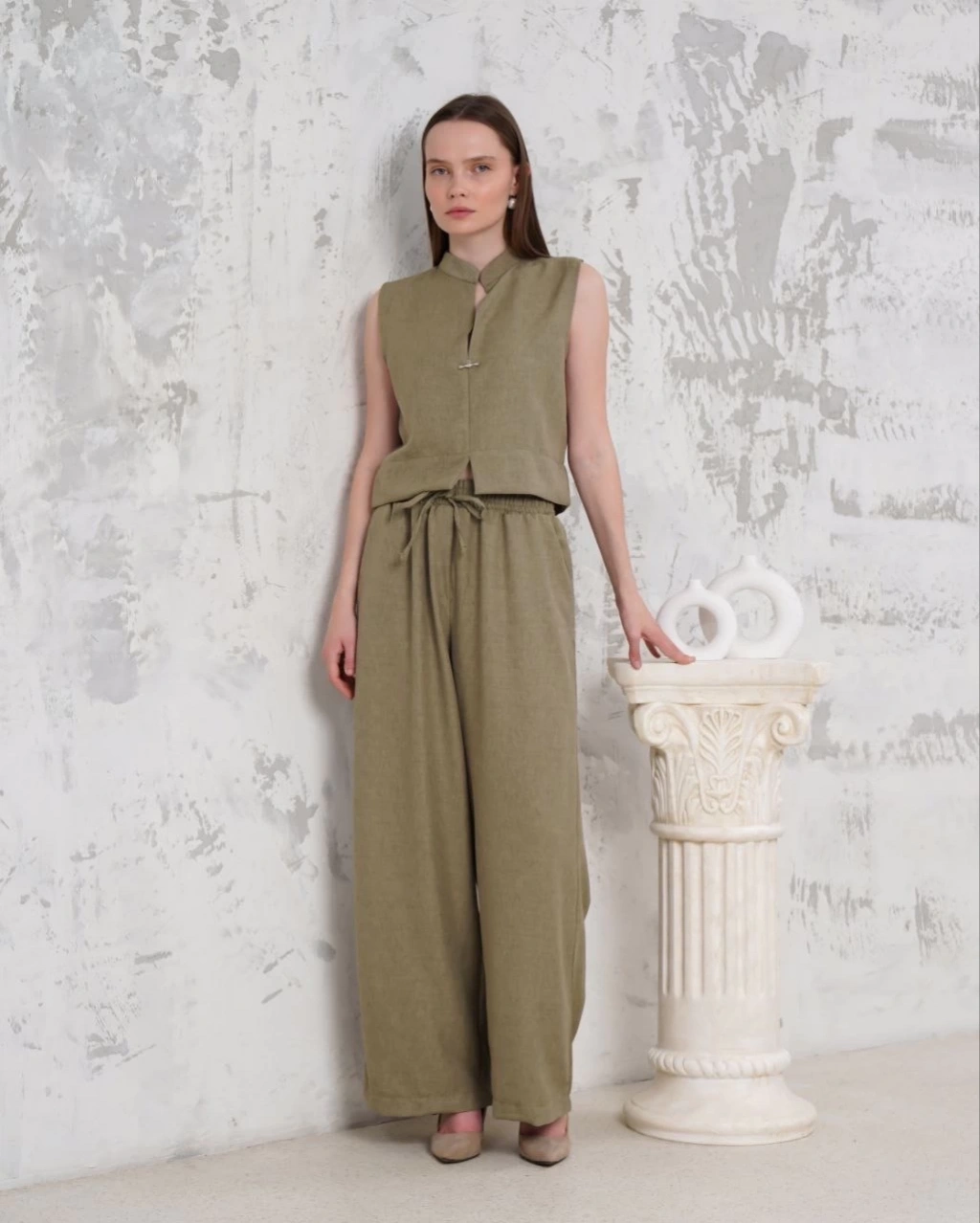 - Yelek ve pantolonun uyumlu kombinasyonu