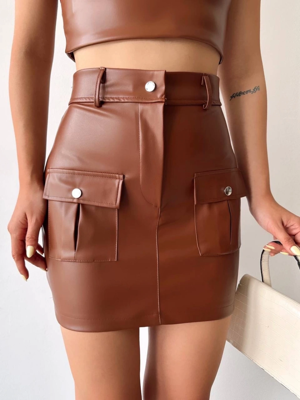 Bu özel tasarım deri etek, gardırobunuzun vazgeçilmezi olmaya aday! Şık ve şık bir görünüm sağlayan öndeki iki cepli detayı ile dikkat çekiyor.