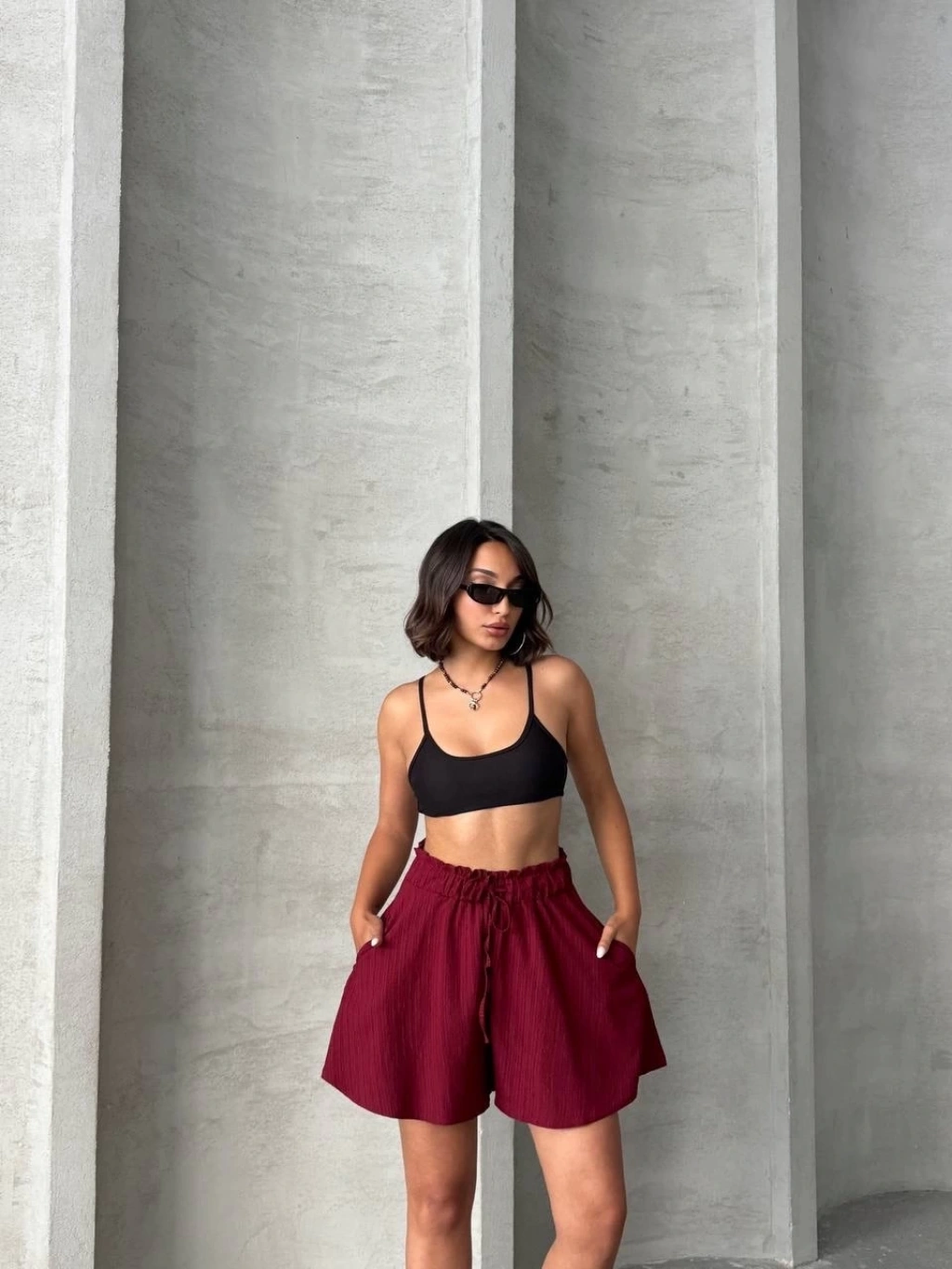Volanlı keten şort bordo s255058, yaz aylarında şıklığından ödün vermek istemeyen kadınlar için ideal bir seçenektir. İnce ve hafif keten kumaşı sayesinde gün boyu konfor sunar.