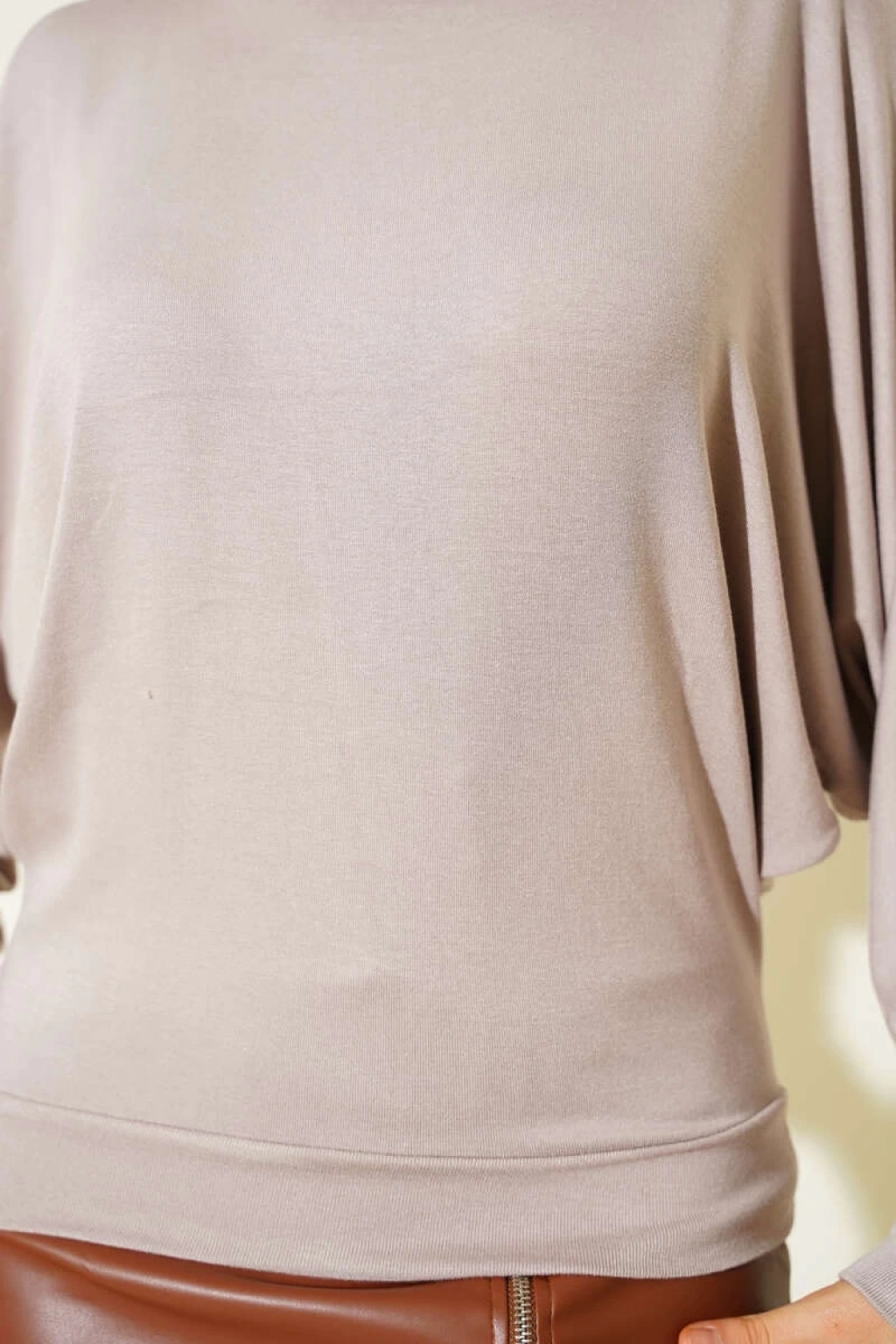 Yarasa Kol Salaş Bluz Vizon T4273, şıklık ve rahatlığı bir arada sunan bir parçadır.